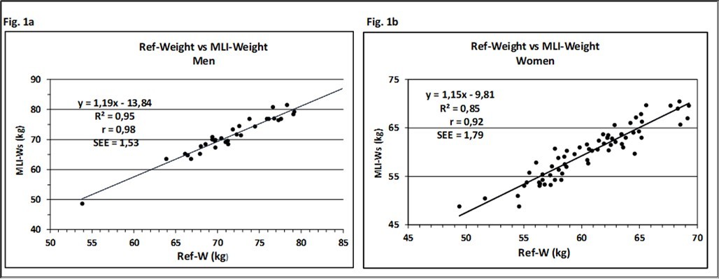 Figure 1.Relationship between Ref-Weight vs. MLI-Weight, skeleton frame adjusted, for men (a) and women (b). Solid line, regression line, R²: coefficient of determination; r: Pearson`s correlation coefficient; SEE: standard error of estimate.