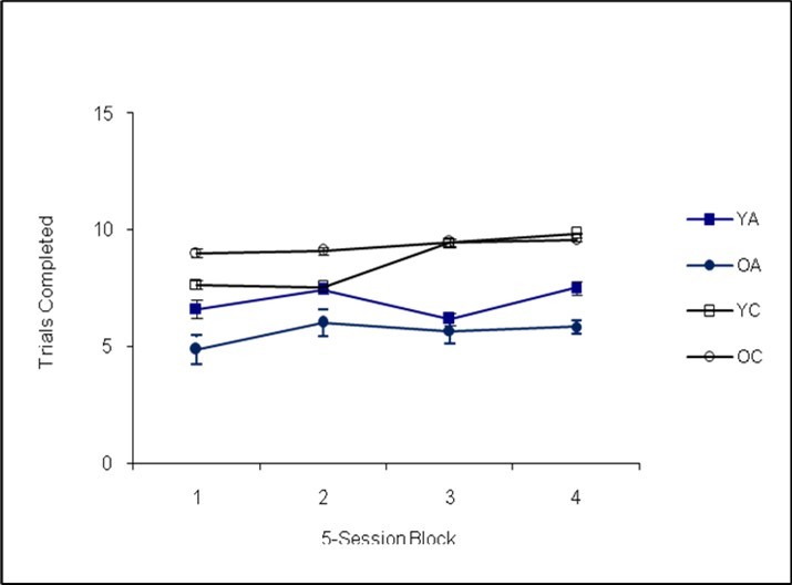 The dependent variables used to assess performance in Phase II included the session duration, trials completed, and errors per trial. Session duration was defined as the amount of time, in min, that each mouse needed to complete one session. Again, the session duration shows whether the animal performed the procedure efficiently or if the animal was inactive during the session. The trials completed are the number of trials that each mouse needed to complete a session. Trials completed, combined with the session duration, show if the animal performed the procedure efficiently. Errors were defined as unrewarded repeat visits to an aperture before the next trial began. Errors per trial were the number of repeat visits per trial averaged over the session. Errors per trial were assessed to evaluate if the animal learned the procedure. For all of the DVs, there were 20 experimental sessions that were grouped into four 5-session blocks to assess learning over time.