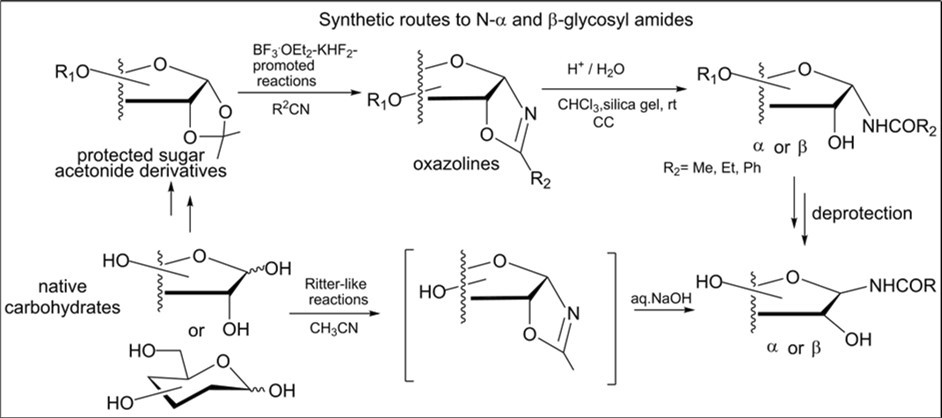 A stereoselective synthesis of N-glycosyl amides was studied from available N-glycosyl oxazolines prepared by Ritter-like reactions of protected sugar acetonides. Hydrolysis reactions of the protected pentofuranosyl and hexafuranosyl oxazolines, as precursors of glycosyl amine derivatives, were carried out in the presence of silica gel in chloroform to giveN-α- and β-glycosyl amides in good yields after column chromatography on silica gel. Access to selectively blocked N-α-xylo-, -ribo-, β-arabino-furanosyl, α-glyco-, α-allo-furanosyl, α- and β-galactopyranosyl amides (twelve examples) useful for preparing modified N-glycosides was accomplished through a mild hydrolysis of sugar oxazolines with 2-alkyl substituents in acidic and neutral conditions. To further explore the scope of the BF3.Et2O-mediated approachdeveloped for N-furanosyl oxazolines, a stereoselective synthesis of protected N-α-hexopyranosyl oxazoline was fulfilled in a high yield from d-galactopyranose diacetonide derivative. The Ritter-like promoted reaction between D-arabinose and benzonitrile afforded 2-phenyl-β-d-arabinofurano-(1,2-d)-2-oxazoline as the main product. In acetonitrile the BF3.Et2O-KHF2-assisted reactions of unprotected native sugars were found to result in the formation of mixtures of N-furanosyl and pyranosyl acetamides.
