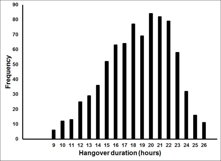 Surprisingly, scientific papers usually do not describe the time course and duration of the alcohol hangover. In 1974, Ylikahri et al examined 23 male subjects after consuming alcohol (1.5 g/kg body weight) 10. Hangover severity was scored throughout the day. The hangover severity scores started to increase 8 hours after drinking and appeared to be most severe 14 hours after alcohol consumption, corresponding to 8am. Starting 16 hours after drinking, severity scores declined rapidly, and after 21 hours after drinking alcohol the hangover severity scores returned towards zero and only a few subject reported hangover symptoms at this timepoint. After waking up, the hangover lasted approximately 12 hours. Given the small sample size and the inclusion of male participants only, we re-analysed data from a large survey on alcohol hangover to further investigate the distribution of hangover duration 11. A recent analysis of a subset of this sample 12 revealed that among N=578 students the mean (SD) duration of their most recent hangover, calculated since their last alcoholic drink consumed, was 18.4 (3.9) hours. The drinking session was followed on average by 6.5 (2.1) hours of sleep. Hangover duration correlated significantly with total sleep time, but not with the amount of alcohol consumed or estimated BAC. Interestingly, those who slept longer consumed significantly more alcohol and reported a significantly extended hangover duration. However, despite consuming significantly more alcohol, long sleepers reported significantly less severe hangovers. The current analyses comprises the full sample of N=811 subjects with a past month alcohol hangover. Aim of the analysis was to determine the average duration of the alcohol hangover.